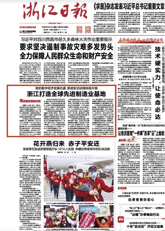 4月1日,《浙江日?qǐng)?bào)》頭版刊發(fā)《搶抓數(shù)字經(jīng)濟(jì)發(fā)展機(jī)遇 推進(jìn)新舊動(dòng)能轉(zhuǎn)換升級(jí) 浙江打造全球先進(jìn)制造業(yè)基地》一文,全文如下: